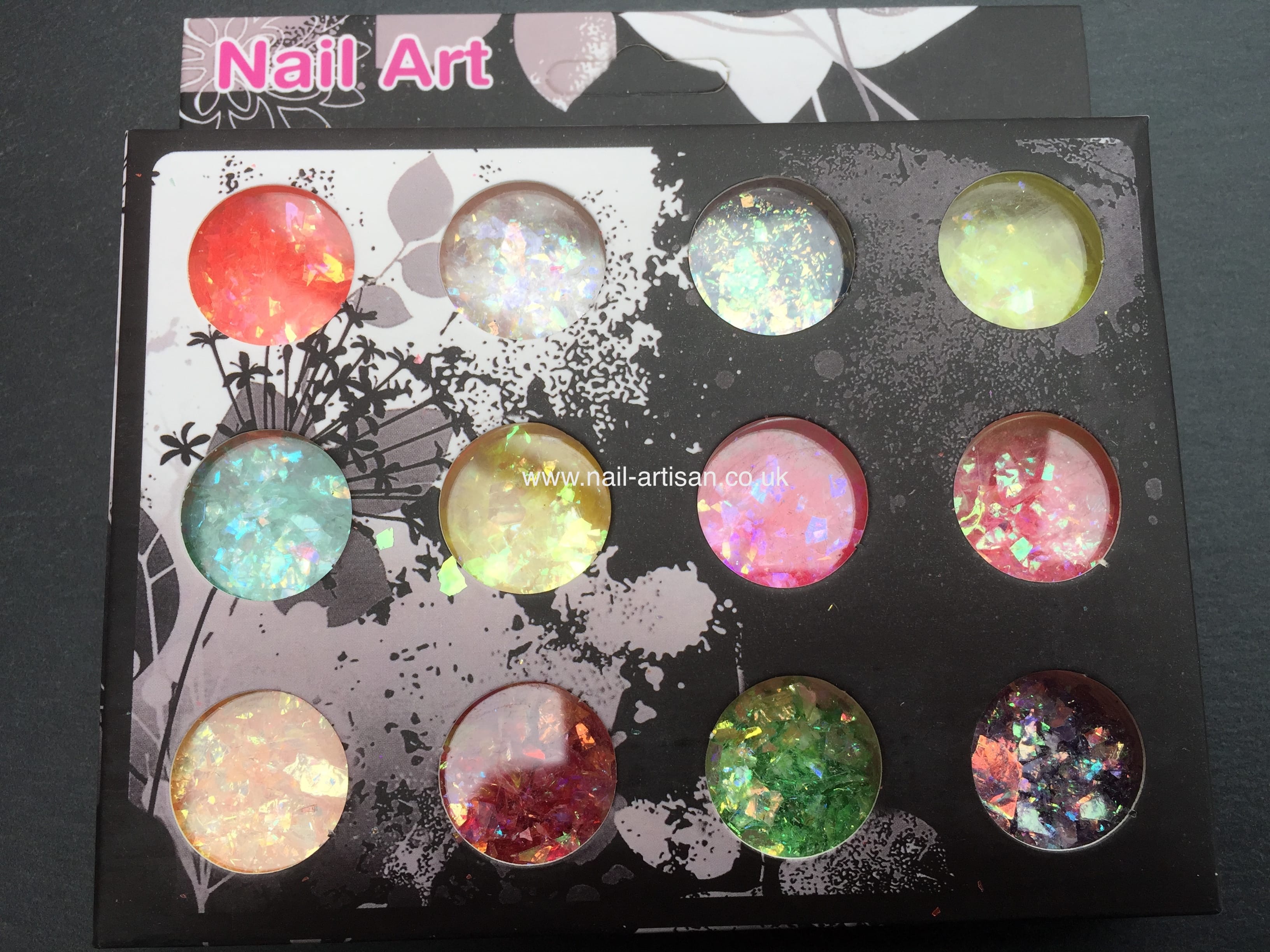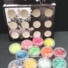 A gift box with 12 different coloured pots of mylar flakes.